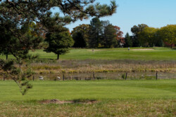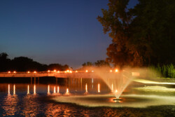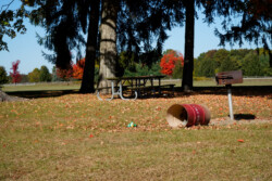 A landscape photo of a lake in the autumn, with a stairway and trees framing a mother and son sitting together on a dock.